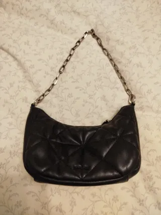 Bolso negro con diseño acolchado y cadena plateada. De bandolera, al hombro. Es como el modelo Cold Re de Valentino. Cierre de cremallera.