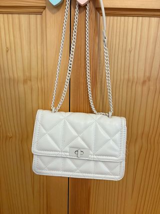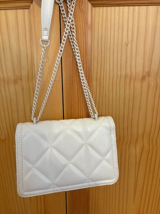 Bolso de mano blanco con diseño acolchado y detalles de cadena. - Cierre de giro metálico. - Asa de cadena plateada. - Acabado brillante.