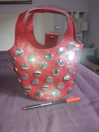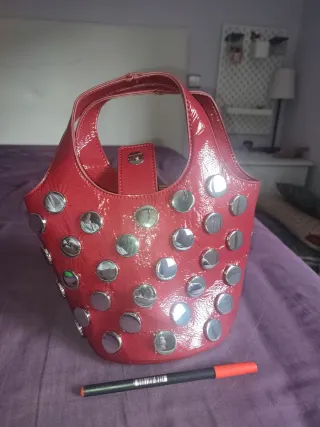 Bolso de mano Parfois con un diseño llamativo. - Color rojo brillante. - Adornos circulares plateados. - Asa cómoda para llevar en la mano. Mide 18 cm de alto y 16 cm de alto.