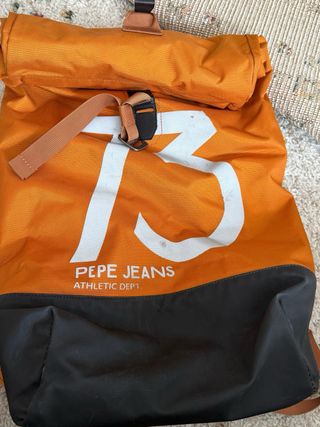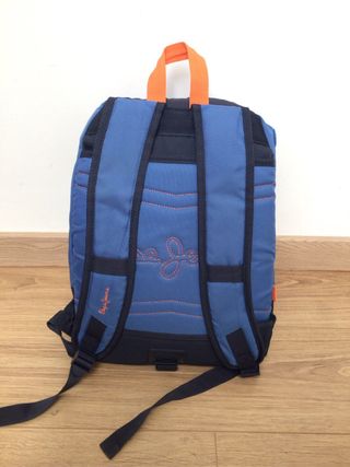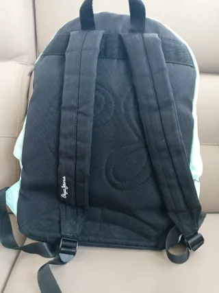 Mochila de la marca Pepe Jeans en tono azul claro. - Diseño moderno y práctico. - Etiqueta de la marca en la parte frontal. - Asa superior y correas ajustables. -poco usada