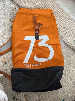 Mochila con un diseño llamativo y práctico. - Color naranja vibrante con detalles en negro. - Número 73 grande en blanco. - Inscripción PEPE JEANS ATHLETIC DEPT.