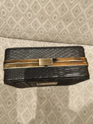 Elegante bolso de mano con un diseño texturizado que imita piel de serpiente. - Acabado en negro. - Detalle metálico dorado con el logo de la marca. - Cierre de solapa.