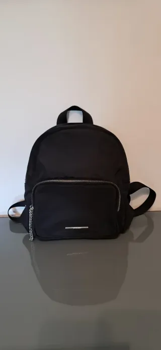 Sin usar; está a estrenar. Mochila negra pequeña, de tejido sintético ligeramenteimpermeable. Cremalleras metálicas en color plateado y tiradores de cadena al tono. Bolsillo interior en el compartimento grande. Tiras de tejido sintético también, y ajustables en longitud. Asa superior. Dimensiones facilitadas en las fotos. Marca: Pull & Bear