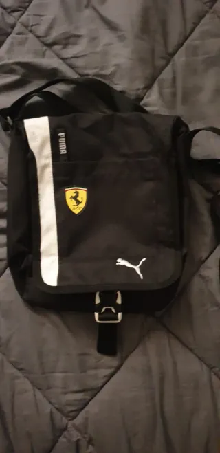 Bolso de la marca Puma, con un diseño inspirado en Ferrari. - Color negro. - Correa ajustable. -Medidas: 27 cm largo, 25 cm ancho