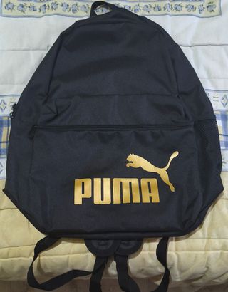 Mochila Puma sin estrenar en color negro y letras doradas. Perfecta para el día a día o para llevar tus pertenencias al trabajo o a clase. - Compartimento principal espacioso. - Bolsillo lateral de malla. - Correas ajustables y acolchadas para mayor comodidad. - Detalle reflectante con el logo de Puma.