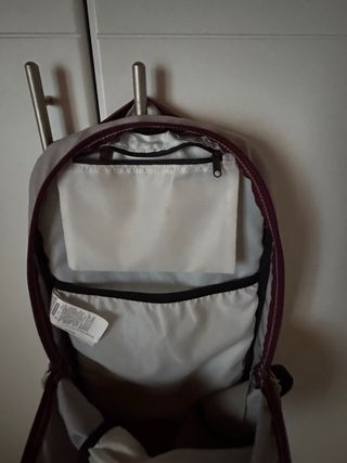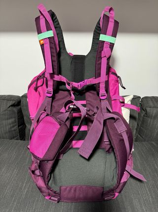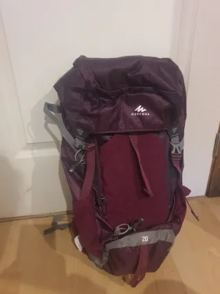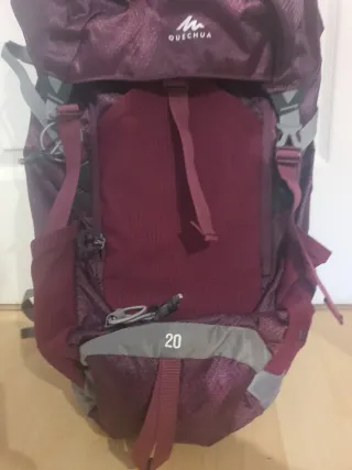 Mochila de senderismo de la marca Quechua con una capacidad de 20 litros. Diseñada en tonos rojos y morados, es práctica para excursiones. - Capacidad de 20L. - Cierre superior con cordón ajustable. - Apertura lateral adicional con cremallera - Bolsillo frontal con cremallera. - Dos bolsillos laterales de malla. - Air cooling, espalda rígida - Cinturón lumbar con 2 bolsillos - Ampliable en capacidad - Funda impermeable incluida - Talla S (menos de 170 cm de estatura) Prácticamente nueva, usada una vez.