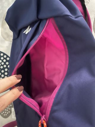 Mochila Quechua modelo Arpenaz 10, perfecta para el día a día o pequeñas excursiones. Incluye neceser - Color azul marino con detalles en rosa. - Compartimento principal con cierre de cremallera. - Bolsillo frontal con cremallera y tirador naranja. - Correas de hombro ajustables.