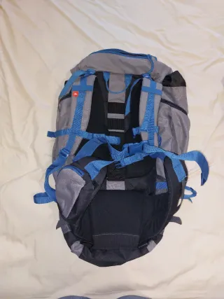 Mochila de gran capacidad, ideal para excursiones y viajes largos. - Capacidad de 70 litros. - Diseño en color azul con detalles en marrón. - Compartimentos amplios para organizar tu equipo. - Correas ajustables para mayor comodidad. - Mochila con funda para lluvia. - Tapa superior desmontable. - Compartimento inferior . - Usada solamente dos veces.