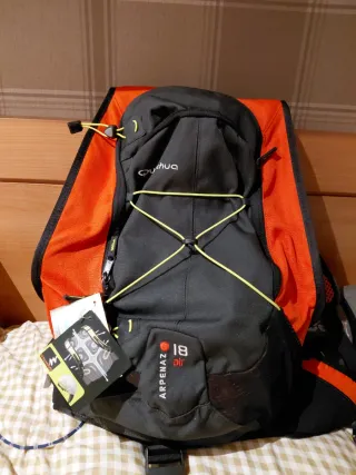 Mochila deportiva Quechua Arpenaz 18L, ideal para tus actividades al aire libre. Cuenta con un diseño moderno y funcional. - Capacidad de 18 litros. - Combinación de colores negro y naranja. - Cierre de cremallera. - Bolsillo frontal con cordón elástico.
