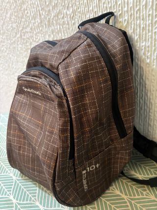 Mochila de la marca Quechua con un diseño a cuadros. - Color marrón con detalles multicolores. - Tejido resistente. 10L