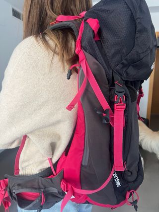 Mochila de senderismo Forclaz 30 Air de Decathlon. Diseñada para ofrecer comodidad y capacidad en tus rutas. - Color negro y detalles en rosa. - Modelo Air para mayor ventilación.