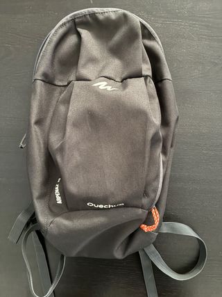 Mochila negra de la marca Quechua. - Diseño moderno y funcional. - Compartimento principal espacioso. - Bolsillo frontal con cremallera. - Correas ajustables para mayor comodidad.