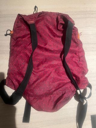 Mochila práctica de la marca Quechua con una capacidad de 20 litros. - Color: Rojo/Rosa. - Compartimento principal espacioso. - Bolsillos laterales de malla. - Cierre con cremallera. Hay que coserle un poquito uno de los asas como se ve en la foto