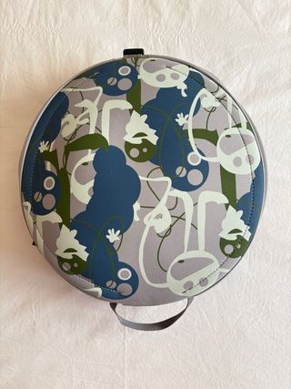 Mochila plegable circular con un diseño llamativo y original. Apertura superior muy práctica ya que se mantiene abierta. Bolsillo interno y externo con cremallera. Medidas: - plegada diámetro 29 cm (Foto 1) - desplegada largo 50 cm (Fotos 2 y 3)