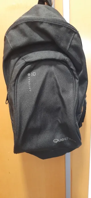 Mochila negra de la marca Quechua. - Diseño moderno y funcional. - Compartimento principal espacioso. - Bolsillo frontal con cremallera. - Correas ajustables para mayor comodidad.