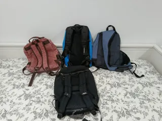 Lote de cuatro mochilas de diferentes marcas. - Mochila azul o,neill. Medidas 43*30. Bolso cruzado y tres compartimentos. - Mochila gris con funda protectora de Samsonite. Medidas 35*30. Múltiples compartimentos incluido para ordenador. Funda protectora de agua. Contiene publicidad. - Mochila roja de tela. Medidas 45*30. 4 compartimientos incluido para ordenador. - Mochila de quechua con escudo de León. Medidas : 40*30. Para cualquier duda consultenme. Gracias