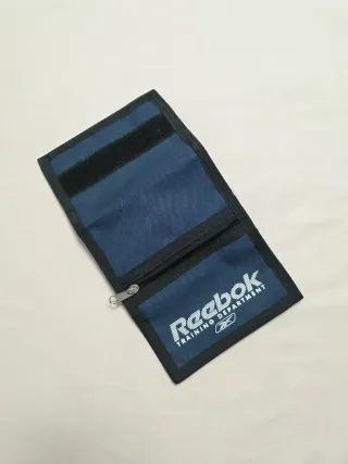 Cartera deportiva Reebok en color azul marino con logo blanco. Diseño tipo tríptico con cierre de velcro. Interior con múltiples compartimentos para tarjetas, billetes y anilla para llaves. Ranura trasparente para DNI. Bolsillo exterior con cremallera para monedas. Estado impecable. Medidas: 12.5 x 8.5