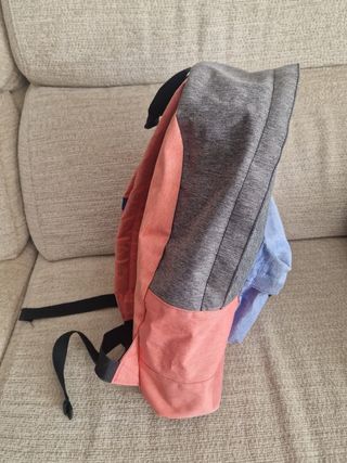 Mochila con un bonito estampado floral. - Diseño con flores en tonos grises y rosas. - Compartimento frontal con cremallera. - Bolsillo lateral de malla. La base está algo gastada de apoyarla en el suelo. Pero aún tiene mucha vida