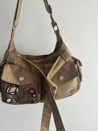 Bolso de mujer con un diseño único y detalles encantadores. - Color base marrón. - Adornos y bordados en tonos rosas. - Cierre de botón. - Bolsillos exteriores.