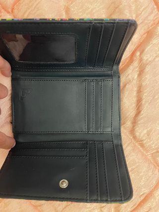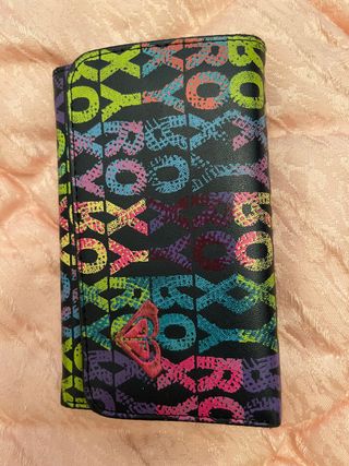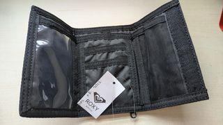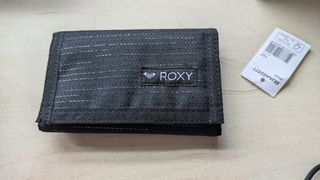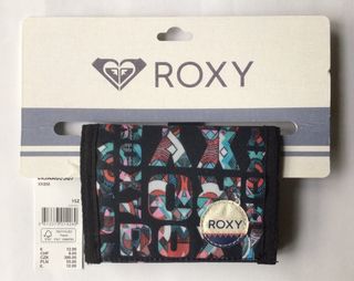 Cartera de doble hoja. Bolsillo interior con cremallera para monedas. Apartados para tarjetas y ventana para carnet. Se cierra con velcro. Material loneta de poliester estampado. Parche de algodon con logotipo Roxy. Nueva, sin utilizar, embalaje original y etiqueta. Medidas 12 x 8 x 2 cm.