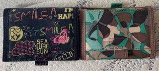 Se venden dos carteras de la marca Roxy. Una tiene un diseño negro con dibujos coloridos y la otra un estampado de camuflaje. - Cartera negra con motivos Smile, Sea Surf Sun y logo. - Cartera con estampado de camuflaje en tonos verdes y marrones. las dos carteras por 15 euros