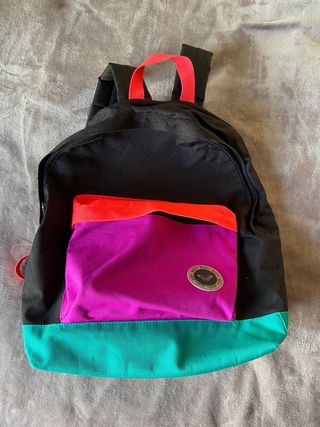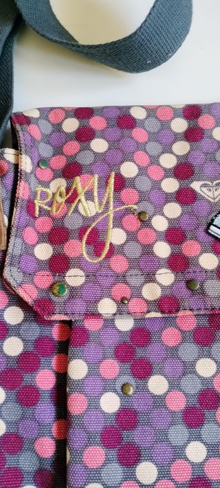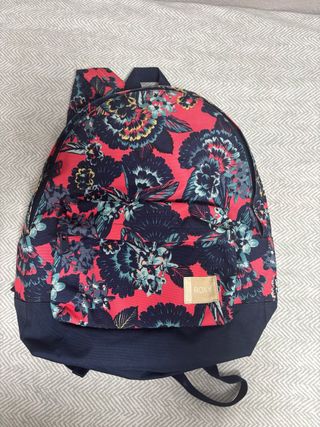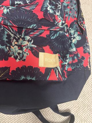Mochila de la marca Roxy con un diseño llamativo. Muchos bolsillos, tiene uno de red lateral. Las cremalleras funcionan todas, rotulo desgastado por el roce
