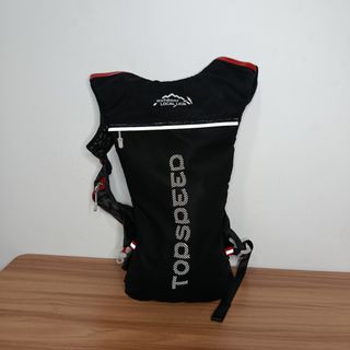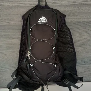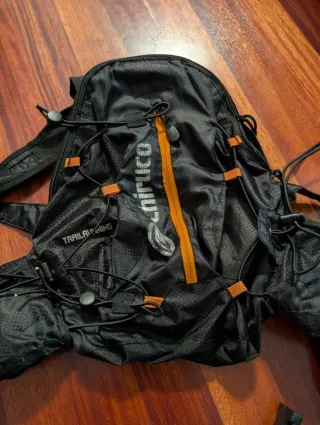 Mochila deportiva usada, ideal para trail running. Está en buenas condiciones, aunque muestra señales de uso. - Diseño ligero y cómodo. - Bolsillos laterales para botellas de agua. - Cremallera frontal principal.
