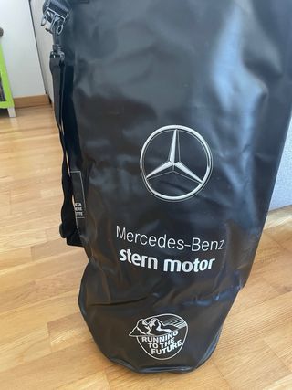 Mochila impermeable de Mercedes-Benz con un diseño moderno y funcional. Ideal para proteger tus pertenencias. - Cierre enrollable para máxima seguridad. - Correa ajustable para mayor comodidad. - Logo de Mercedes-Benz visible. - Estampado Running to the Future en la parte inferior.