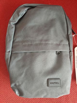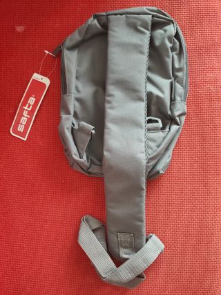 Mochila de una sola tira (o asa), pequeña o bolsito cruzado color gris. Nueva, nunca usada. Bolsillo delantero y posibilidad de poner la tira a los dos lados. Perfecta para llevar vacíos los bolsillos y llevar toda la documentación del día a día.
