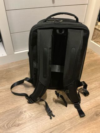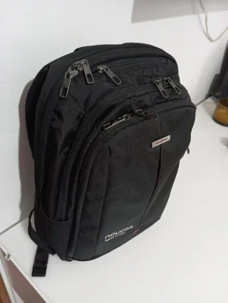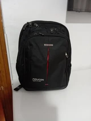 Mochila Samsonite en color negro, ideal para llevar tu portátil. Volumen 17,5 l Alto 40 cm Ancho 29 cm Profundidad 18 cm Pesob0,7 kg Tamaño máximo del portátil 14 pulgadas Nuevo sin uso Precio original alrededor de 90€ Lleva logotipo frontal de “Noucor ” al tratarse de una edición promocional del modelo original de Samsonite La calidad, diseño y prestaciones son las mismas del modelo comercial. Se realizan envíos