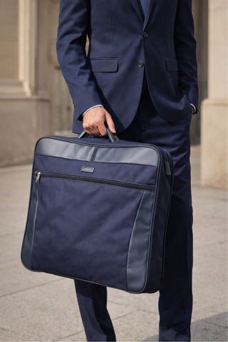 Portatrajes de la marca Samsonite en color azul marino. - Diseño elegante con detalles en marrón. - Asa de mano y correa para hombro. - Compartimento principal amplio.