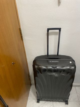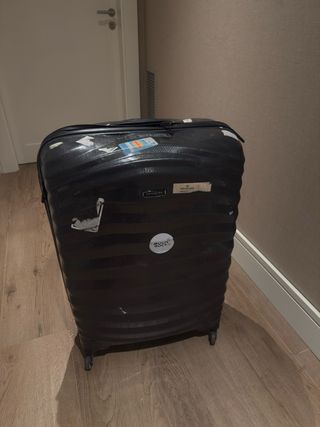 Maleta Samsonite en color negro. Buen estado, solo tiene algunos arañazos en la parte exterior. El único problema es que tiene rota la asa para transportarla (como se ve en la foto).