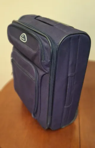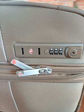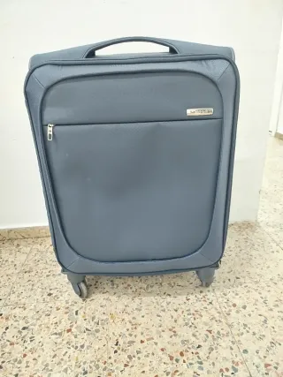 Maleta de cabina de la marca Samsonite. Perfecta para viajes cortos. - Diseño moderno y funcional. - Ruedas para facilitar el transporte. - Asa retráctil. - Cremallera de seguridad. Defectos: Tiene un descosido en un borde (ver foto) La carcasa interior (que va dentro de la tela) esta rota. La maleta cumple perfectamente su funcion aun con los defectos indicados
