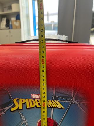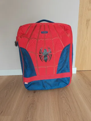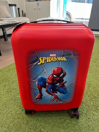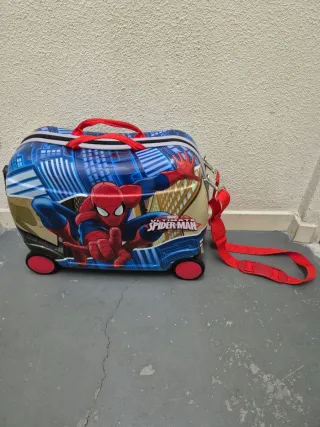 Maleta infantil con diseño de Spiderman. Permite llevar al niño sentado en ella. En muy buen estado, poco uso. - Ruedas rojas. - Asa superior roja. - Correa de hombro ajustable.