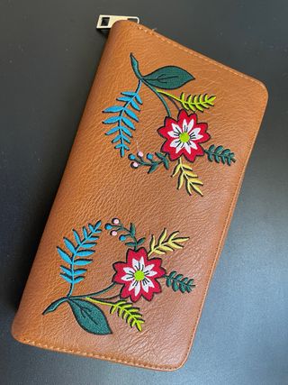 Elegante cartera marrón con un bonito bordado floral. - Diseño con flores y hojas bordadas. - Cierre de cremallera.