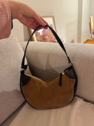 Bolso de hombro con efecto ante y detalles en piel. - Diseño curvo y moderno. - Cierre de cremallera superior. - Asa para llevar al hombro.