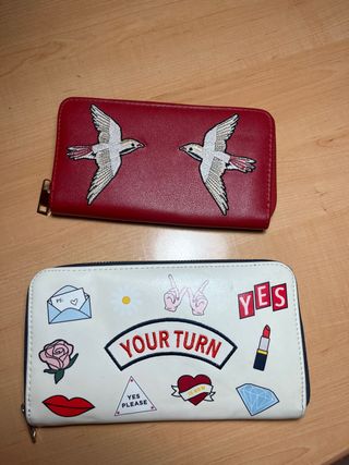 Dos carteras con diseños únicos. - Una cartera roja con dos pájaros bordados. - Una cartera blanca con varios parches: labios, rosa, sobre, flor, YOUR TURN, YES PLEASE, corazón, YES y pintalabios.