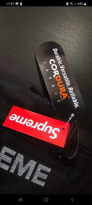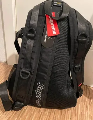Mochila negra de la colaboración entre Supreme y Cordura completamete nueva con las etiquetas originales colgadas. - Fabricada con materiales Cordura. - Diseño con logo grande de Supreme.