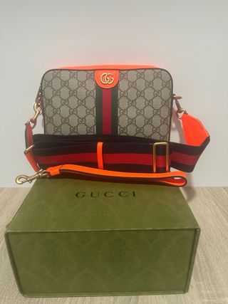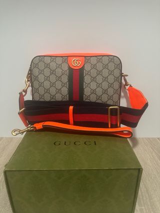 Bolso de la marca Gucci con el icónico estampado GG Supreme. - Detalles en naranja vibrante. - Correa ajustable. - Incluye caja original.
