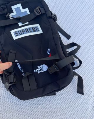 Mochila negra con detalles de Supreme y The North Face. - Diseño con logo de Supreme. - Parche con logo de The North Face. - Detalle de Summit Series.