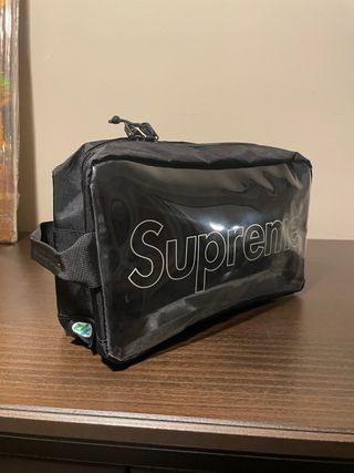 Neceser Supreme Utility Bag FW18 en color negro. Diseño icónico con panel lateral transparente y logo Supreme grande visible. En la parte trasera incorpora el box logo bordado en negro. El interior está completamente forrado con tela negra con patrón Supreme repetido, un detalle muy característico del modelo y de alta calidad. Usado solo 2 veces, estado prácticamente nuevo, sin desgaste ni defectos. Conservado en perfecto estado, tal y como se aprecia en las fotos. Artículo 100% original, comprado en tienda Supreme de Londres. Incluyo fotos detalladas de todas las partes y de las etiquetas.
