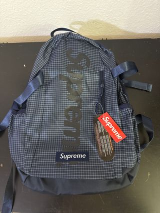 Mochila Supreme con un diseño de cuadros llamativo. - Diseño de cuadros en azul y negro. - Logo de Supreme en la parte frontal.