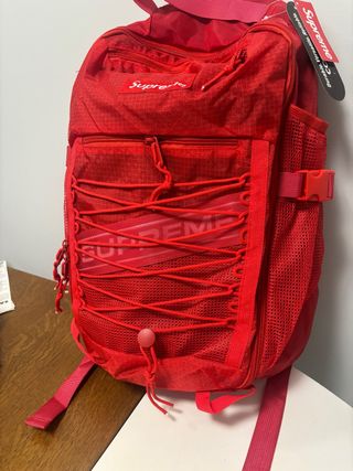 Mochila de la marca Supreme en color rojo. Cuenta con un diseño moderno y práctico. NO NEGOCIABLE - Compartimento principal espacioso. - Bolsillos laterales de malla. - Correas ajustables para mayor comodidad.