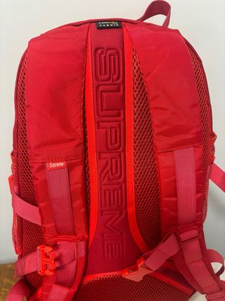 Mochila de la marca Supreme en color rojo. - Fabricada con material Cordura. - Diseño con logo grande en la parte frontal. - Bolsillos laterales de malla. - Correas ajustables para los hombros.