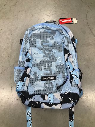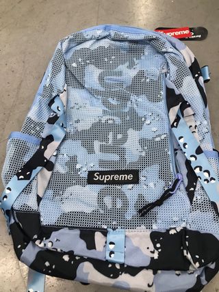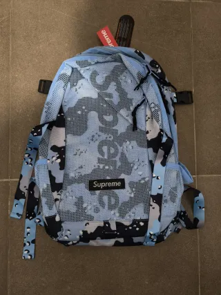 Mochila Supreme con un llamativo diseño de camuflaje. - Estampado de camuflaje en tonos azules, negros y grises. - Malla exterior. - Bolsillos laterales. - Etiqueta con el logo de Supreme.