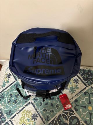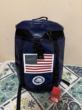 Mochila de la colaboración entre The North Face y Supreme. - Diseño en color azul. - Parche con la bandera de Estados Unidos. - Insignia circular con logo y texto 'The North Face Supreme 1996'. -30 Litros