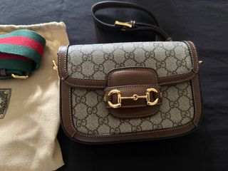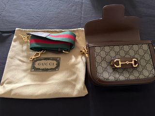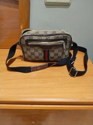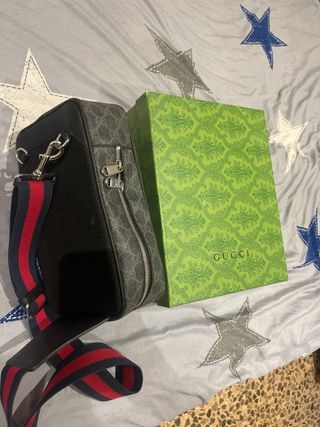 Bolso pequeño de la icónica marca Gucci. Como nuevo. Tiene 2 correas una marrón y otra verde y roja. Medidas 21 de ancho por 15 largo. Original. - Diseño clásico con el distintivo Horsebit. - Combinación de lona GG Supreme y piel. - Correa ajustable para llevar al hombro o cruzado.