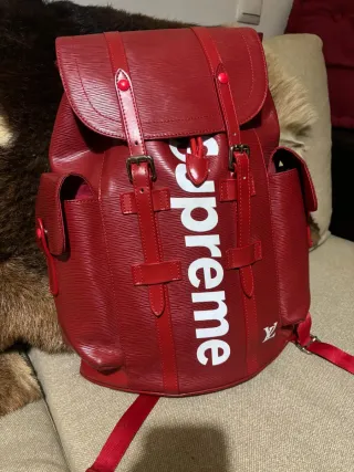 Mochila de edición limitada Louis Vuitton x Supreme en color rojo. - Diseño con el logo Supreme en blanco. - Material con textura característica. - Bolsillos laterales. - Cierre de solapa con correas. - Cremallera interior no funciona.
