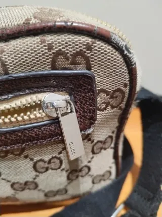En la segunda foto se puede ver lo único que está un poco rallado en la parte de arriba, no hay nada más. Riñonera con el clásico estampado GG de Gucci. - Diseño en lona GG Supreme. - Detalles en piel marrón. - Raya verde y roja central. - Correa ajustable negra.