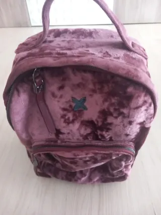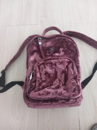Mochila de Stradivarius en color rosa, con un acabado de terciopelo suave. - Cierre de solapa con hebilla. - Bolsillo frontal con cremallera. - Tirantes ajustables. ** Está en perfecto estado. -- Acepto envíos.